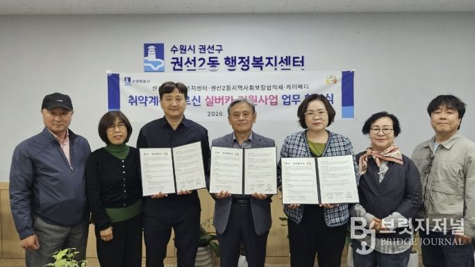 브릿지저널 김경미 기자 | 수원시 권선구 권선2동은 지난 23일, 권선2동 지역사회보장협의체, 케이메디와 취약계층 어르신의 안전한 이동 지원과 삶의 질 향상을 위한 “실버카(보행보조기) 지원사업 업무협약(MOU)”을 체결했다.