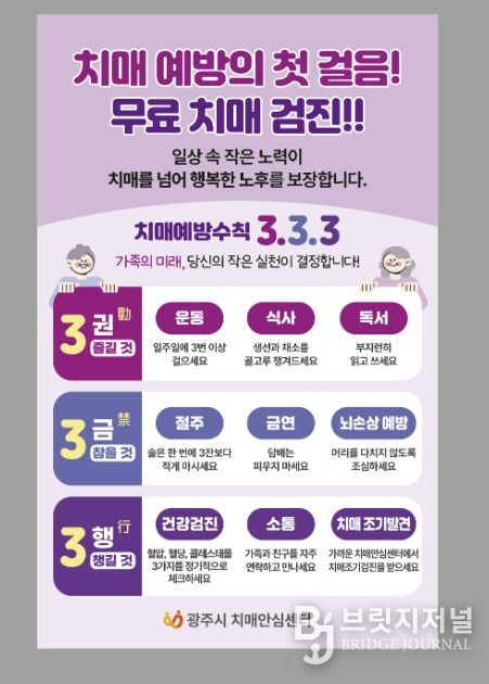 브릿지저널 김경미 기자 | 광주시치매안심센터는 치매 발병 위험이 높은 고령층을 집중 관리하기 위해 오는 29일부터 30일까지 광주시 스포츠헬스센터에서 ‘치매 조기 검진 및 인식 개선 캠페인’을 실시한다고 27일 밝혔다.