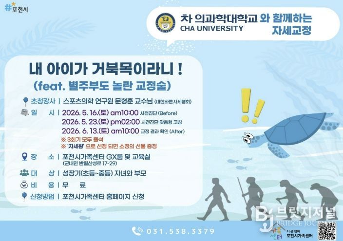 브릿지저널 김경미 기자 | 포천시 더 큰 행복 포천시가족센터는 오는 5월 16일부터 6월 13일까지 성장기 자녀를 둔 가족을 대상으로 부모역할지원사업 ‘내 아이가 거북목이라니! feat.별주부도 놀란 교정술’ 프로그램을 운영한다.