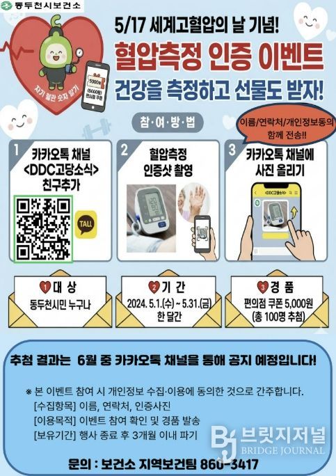 브릿지저널 김경미 기자 | 동두천시보건소는 오는 5월 17일 세계고혈압의 날을 기념해 시민들의 심뇌혈관질환 예방과 건강관리 실천을 유도하고자 ‘혈압측정 인증 이벤트’를 운영한다고 밝혔다.