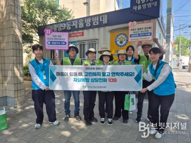 브릿지저널 김진석 기자 | 대구 남구보건소(남구정신건강복지센터)는 지난 4월 15일 자살 고위험 기간 집중 관리를 위하여 대명9동 일대를 중심으로 대명9동 자율방범대(생명지킴이)와 협력하여 생명존중 가두캠페인을 펼쳤다.