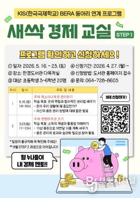 브릿지저널 정보영 기자 | 제주시 한경도서관은 지역 어린이들의 경제에 대한 호기심을 키우고 주도적인 자립 역량 형성을 지원하기 위해 한국국제학교(KIS) 동아리와 연계한 ‘새싹 경제 교실: STEP 1’을 운영한다.