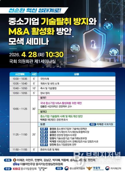 브릿지저널 김경미 기자 | 이재관 의원(충남 천안을·더불어민주당)이 오는 28일 오전 10시30분 국회 의원회관 제1세미나실에서 ‘선순환 혁신 생태계로! 중소기업 기술탈취 방지와 M&A 활성화 방안 모색 세미나’를 개최한다고 밝혔다.