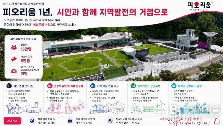 남원시 관계자는 “피오리움은 장기간 방치된 공간을 시민과 관광객이 찾는 복합문화 거점으로 전환한 사례”라며 “앞으로도 유휴공간과 폐자원을 시민이 일상에서 찾는 문화공간이자 관광의 거점으로 키워, 지방 소도시가 안고 있는 과제에 대응해 나가겠다”고 말했다.