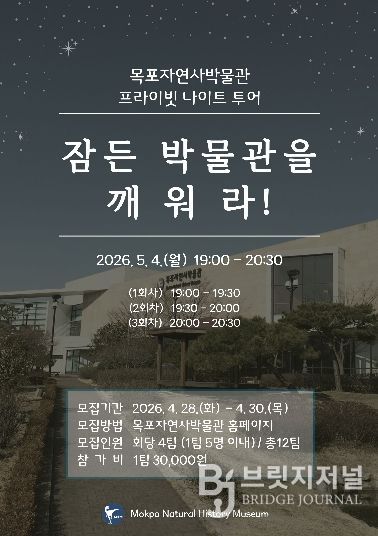 브릿지저널 김경미 기자 | 목포자연사박물관은 오는 5월 4일 오후 7시부터 8시 30분까지 야간 특별 프로그램인 ‘프라이빗 나이트 투어’를 운영한다.