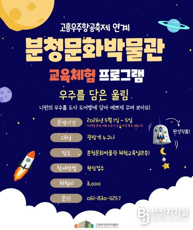 브릿지저널 김경미 기자 | 고흥군 분청문화박물관은 제16회 고흥우주항공축제와 연계해 관람객과 지역민을 대상으로 특별 교육체험 프로그램 ‘우주를 담은 울림’을 오는 5월 1일부터 5일까지 한시적으로 운영한다고 밝혔다.