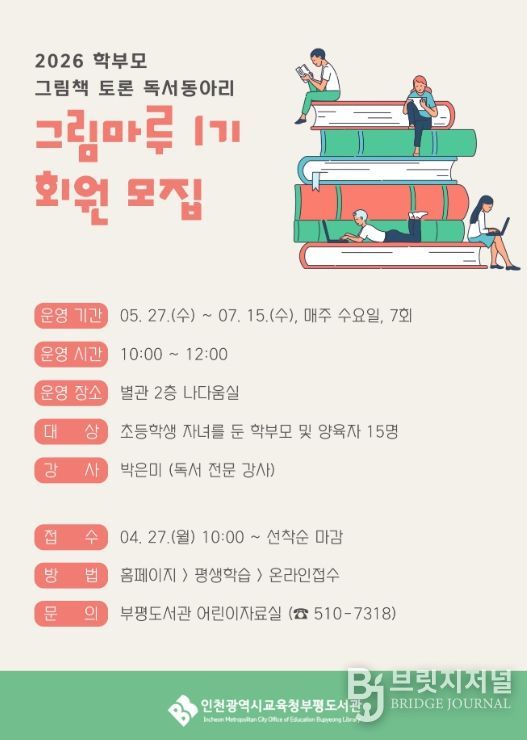 브릿지저널 김경미 기자 | 인천광역시교육청부평도서관은 학부모의 독서 역량을 강화하고 자녀와의 소통을 돕기 위해 2026년 상반기 학부모 독서동아리 ‘그림마루 1기’ 참여자를 모집한다.
