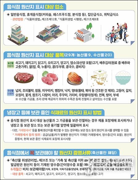 현행 원산지 표시제에 따르면 음식점은 쌀·콩·배추김치 등 농산물 3종과 쇠고기·돼지고기·닭고기 등 축산물 6종, 넙치·고등어·갈치 등 수산물 20개 품목에 대해 원산지를 의무적으로 표시해야 한다.