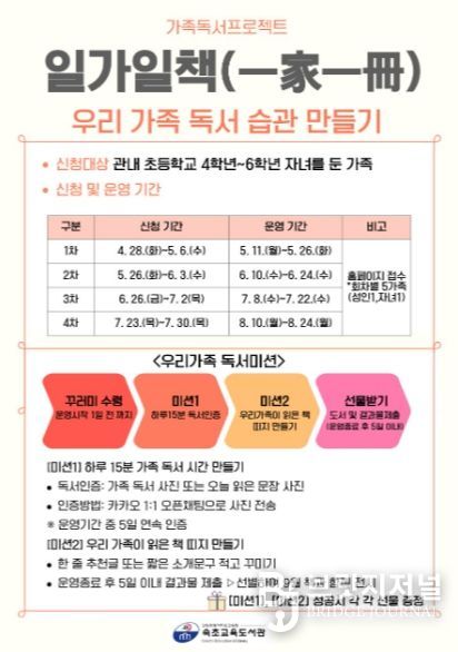 5월에 운영될 1차 ‘일가일책’ 참가신청은 4월 28일(화)부터 5월 6일(수)까지 속초교육도서관 누리집을 통해 선착순으로 진행된다.