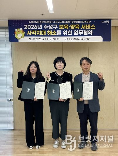 브릿지저널 김진석 기자 | 대구 수성구육아종합지원센터(센터장 심영숙)는 지난 24일 수성구 드림스타트센터(센터장 김은미), 함장종합사회복지관(관장 권혁철)과 지역 내 보육·양육 서비스 사각지대 해소를 위한 ‘3자 업무협약(MOU)’을 체결했다고 밝혔다.