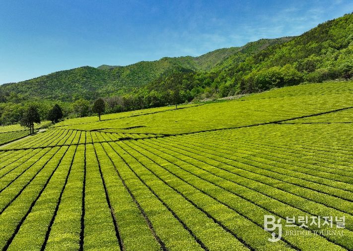 드넓게 펼쳐진 연두색 차밭이 짙푸른 산세와 조화를 이루며 마치 한 폭의 수채화를 그려낸 듯한 장관을 연출하고 있다.