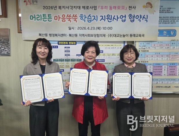 브릿지저널 윤나영 기자 | 부산 동래구 복산동 행정복지센터는 지난 23일 복산동지역사회보장협의체, (주)대교눈높이 부산동래교육국과 ‘머리튼튼 마음쑥쑥' 학습지 지원사업 추진을 위한 협약을 체결했다고 밝혔다.