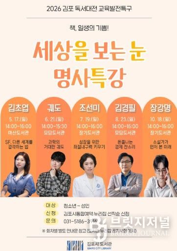 브릿지저널 김경미 기자 | 김포시 도서관은 2026 김포 독서대전 교육발전특구 사업으로 '세상을 보는 눈, 명사특강'을 오는 5월 17일부터 10월 18일까지 5회에 걸쳐 관내 도서관 3곳에서 진행한다.