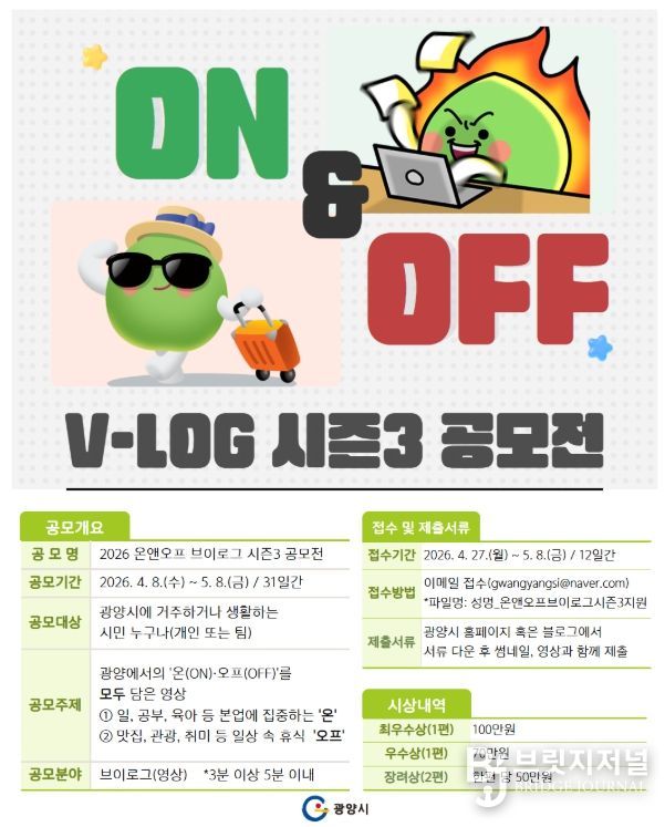 브릿지저널 김경미 기자 | 광양시는 시민의 시선으로 지역의 일상과 매력을 영상으로 담아내는 ‘2026 온앤오프 브이로그 시즌3’ 공모전 접수를 4월 27일부터 5월 8일까지 받는다고 밝혔다.