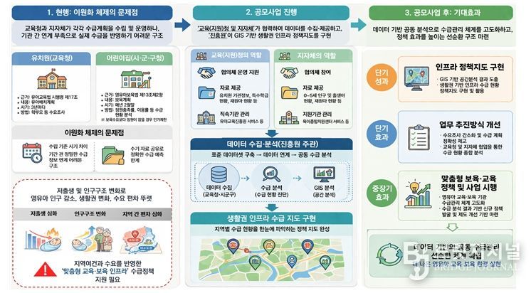 브릿지저널 김경미 기자 | 교육부와 한국보육진흥원(원장 조용남)은 모든 영유아가 집 근처에서 질 높은 교육·보육 서비스를 받을 수 있도록 유치원과 어린이집 수급 정보를 한 곳에서 분석·제공하는 ‘영유아 교육·보육 인프라 데이터 체계 구축 시범지역 공모’를 실시한다.