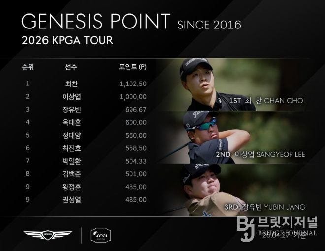 최찬은 ‘2026 우리금융챔피언십’에서 최종합계 13언더파 271타로 우승해 제네시스 포인트 1,000 포인트를 추가한 1,102.50 포인트로 단숨에 제네시스 포인트 1위에 올라섰다. 최찬이 제네시스 포인트 1위에 위치한 것은 2022년 투어 입성 이후 최초다.