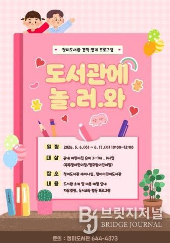 브릿지저널 김경미 기자 | 이천시 청미도서관은 오는 5월 6일부터 6월 17일까지 관내 어린이집 유아를 대상으로 도서관 견학 연계 프로그램 ‘도서관에 놀.러.와’를 운영한다.