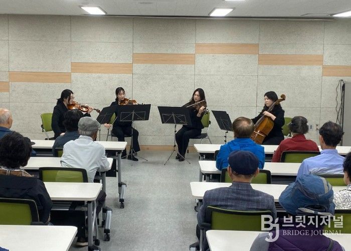 이날 공연에는 부산시립예술단 청소년교향악단 단원 4명(바이올린, 비올라, 첼로)이 참여해 ‘사랑의 인사’, ‘베토벤 바이러스’, ‘어머나’, ‘붉은 노을’ 등 다양한 곡을 현악 앙상블로 선보였다. 특히 익숙한 멜로디를 중심으로 구성된 프로그램은 어르신들의 높은 호응과 적극적인 참여를 이끌어냈다.
