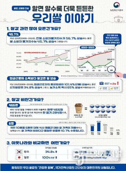 쌀은 ‘주식’으로, 쌀 적정 가격을 통해 소비자는 든든한 주식을 공급받고, 농업인은 안정적으로 농사지을 수 있는 기반을 조성할 수 있다. 정부는 농업인과 소비자 모두에게 안정적인 적정 쌀값이 유지되도록 수급관리에 최선의 노력을 다할 계획이라고 전했다.