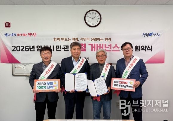 브릿지저널 김경미 기자 | 양산시 상하수도사업소 수도과는 청렴에 대한 사회적 관심을 유도하고 청렴의식을 확산하기 위해 관내 수도급수공사 대행 지정업체와 함께 민관 청렴 거버넌스를 구성하고, 이를 위한 협약식을 가졌다.