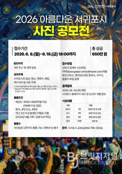브릿지저널 정보영 기자 | 서귀포시는 지역의 다양한 매력을 발굴하고 이를 홍보 콘텐츠로 적극 활용하기 위해 ‘2026 아름다운 서귀포시 사진 공모전’을 개최한다.