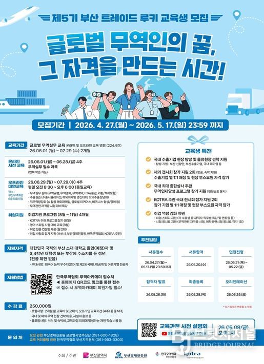 브릿지저널 윤나영 기자 | 부산시는 (재)부산경제진흥원, 한국무역협회 부산지역본부와 함께 지역 청년 무역 인재 육성을 위한 '제5기 부산 트레이드 루키' 과정에 참여할 교육생을 모집한다고 밝혔다.