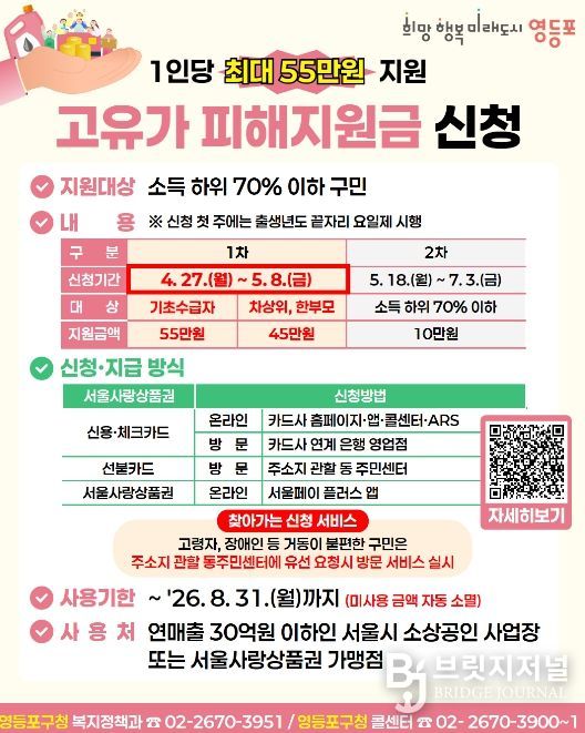 브릿지저널 김경미 기자 | 영등포구가 계속되는 고유가 상황 속에서 구민들의 경제적 부담을 완화하기 위해 ‘고유가 피해지원금’ 지급에 나선다고 밝혔다. 이번 지원금은 2026년 3월 30일을 기점으로 소득하위 70% 이하인 구민을 대상으로 하며, 소득 수준에 따라 차등 지급된다.