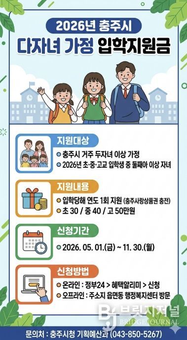 브릿지저널 김경미 기자 | 충주시는 다자녀 가정의 경제적 부담을 완화하고 안정적인 양육 환경을 조성하기 위해 2026학년도 초·중·고등학교에 입학하는 둘째 자녀 이상에게 입학지원금을 지원한다고 밝혔다.