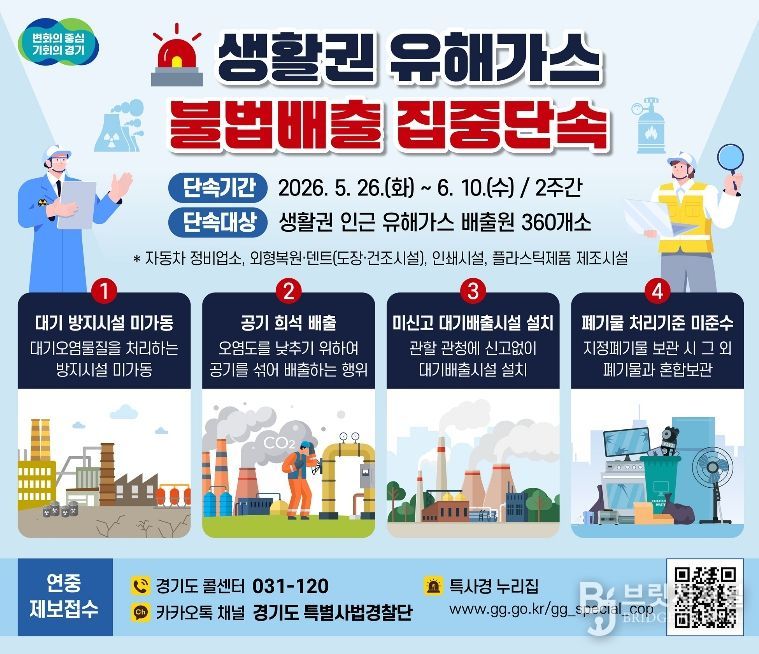 브릿지저널 김경미 기자 | 경기도 특별사법경찰단이 5월 26일부터 6월 10일까지 2주간 주거지·학교·병원 등 생활권 인근 지역의 유해가스 배출 사업장을 대상으로 불법행위를 집중단속 한다.