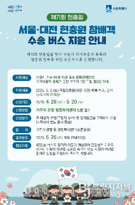 브릿지저널 김경미 기자 | 수원특례시가 제71회 현충일인 6월 6일, 국립현충원(서울·대전)까지 이동이 여의치 않은 국가유공자 유족을 위해 현충원 왕복 수송버스를 운행한다.