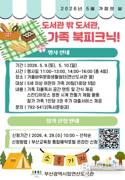 브릿지저널 윤나영 기자 | 부산광역시립연산도서관은 다음달 9일부터 10일까지 이틀간 도서관 옆 거울바위문화생활쉼터에서 5세 이상 어린이를 동반한 가족 20팀을 대상으로 ‘도서관 밖 도서관, 가족 북피크닉!’ 행사를 운영한다.