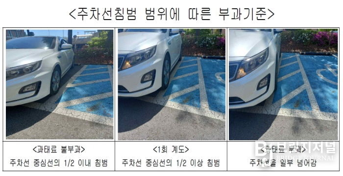 시에 따르면, 차량이 주차선 중심선을 기준으로 절반 이하만 침범한 경우에는 일부가 선에 걸쳐 있더라도 과태료를 부과하지 않는다. 그러나, 중심선을 기준으로 절반 이상 넘어간 경우에는 주차선 침범으로 간주하며, 최초 1회에 한해 계도 조치가 이루어진다. 다만, 차량이 주차구획선을 명확히 넘어 장애인전용주차구역 안으로 일부라도 침범한 경우에는 관련 법령에 따라 10만 원의 과태료를 부과한다.