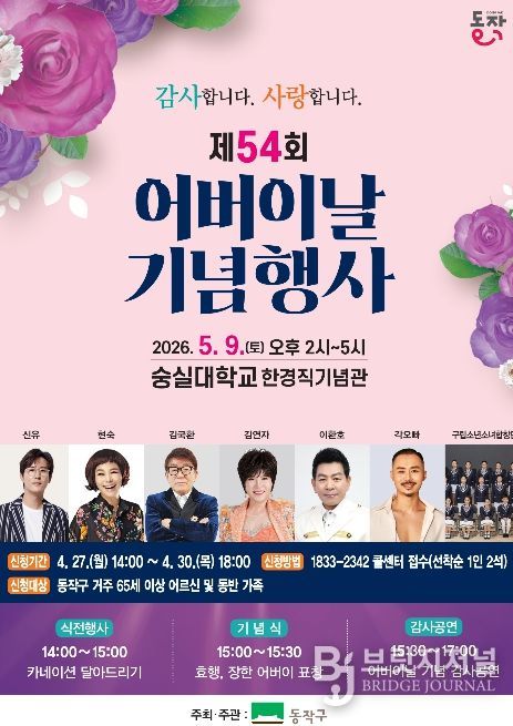 브릿지저널 김경미 기자 | 동작구가 오는 5월 9일 오후 2시 숭실대학교 한경직기념관에서 ‘제54회 어버이날 기념행사’를 개최한다고 밝혔다.