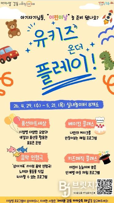 한편, 5월 5일 어린이날에는 강동구청 열린뜰과 강동어린이회관 일대에서 ‘2026 강동어린이대축제’가 열린다. ‘컬루와 친구들’ 축하공연을 시작으로 다양한 체험 프로그램과 공연, 참여형 놀이가 펼쳐진다. 특히, ‘장난감 순환마켓’에서는 강동구 장난감도서관에서 대여하던 상태 양호한 장난감 200여 점을 저렴하게 판매해 자원순환을 실천하고 가정의 경제적 부담을 덜어줄 것으로 기대된다.