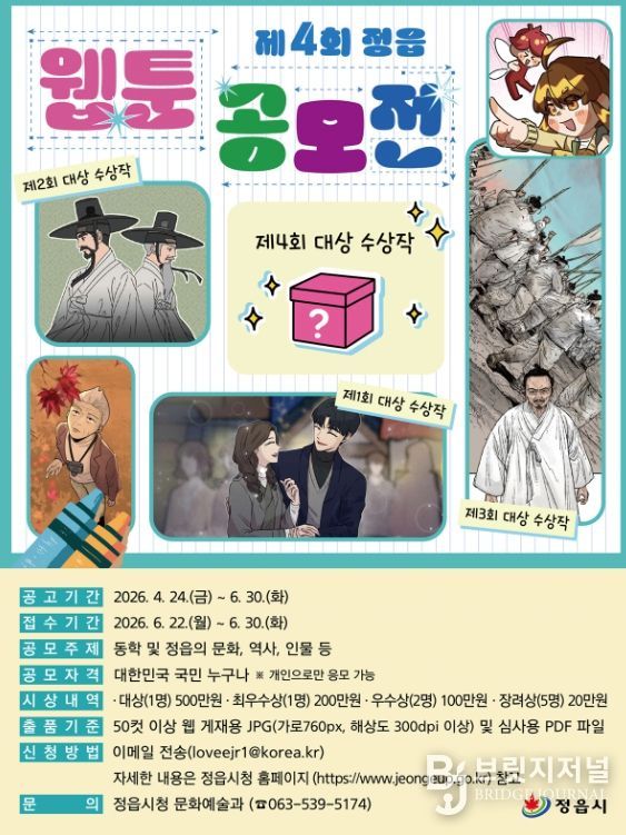 브릿지저널 윤나영 기자 | 정읍시가 지역의 가치를 발굴하고 창의적인 홍보 자료를 확보하기 위해 ‘제4회 정읍 웹툰 공모전’을 개최한다.