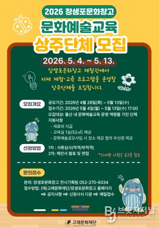 브릿지저널 윤나영 기자 | (재)고래문화재단이 운영하는 장생포문화창고는 어린이와 시민들에게 예술 체험을 선물할 ‘문화예술교육 상주단체’를 모집한다고 28일 밝혔다.