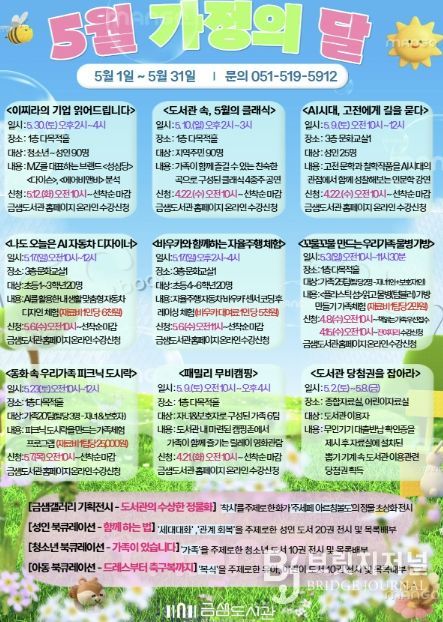 브릿지저널 윤나영 기자 | 부산 금정구 금샘도서관은 5월 가정의 달을 맞아 오는 5월 1일부터 31일까지 작가(유튜버) 강연, 클래식 공연, 체험행사 등 온 가족이 함께 즐길 수 있는 '가정의 달' 특별 프로그램을 운영한다고 밝혔다.