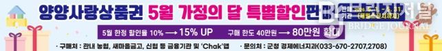브릿지저널 윤나영 기자 | 양양군이 5월 가정의 달을 맞아 군민들의 경제적 부담을 덜고 침체된 지역 상권을 살리기 위해 양양사랑상품권 특별 할인 판매를 실시한다고 밝혔다.