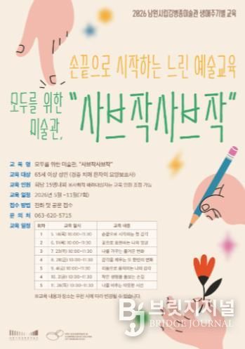 브릿지저널 윤나영 기자 | 남원시립김병종미술관은 오는 5월부터 11월까지 실버세대를 위한 생애주기별 예술교육 프로그램 '모두를 위한 미술관, ‘사브작사브작’' 을 운영한다고 밝혔다.