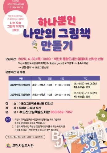 익산시 수도산그림책숲도서관은 오는 5월 16일부터 초등학생을 대상으로 '하나뿐인 나만의 그림책 만들기' 수업을 운영한다.