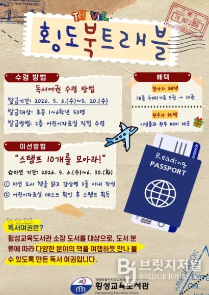브릿지저널 윤나영 기자 | 횡성교육도서관은 5월 6일부터 6월 30일까지 어린이들의 자발적인 독서 습관 형성과 도서관 이용 활성화를 위해 독서 여권을 활용한 ‘횡도북트래블’ 프로그램을 운영한다고 밝혔다.