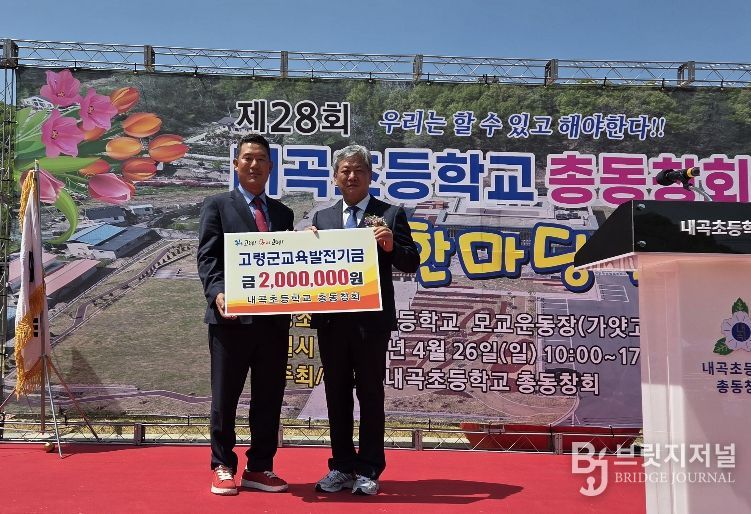 브릿지저널 정보영 기자 | 내곡초등학교 총동창회(회장 문수열)에서 4월 26일(일) 가얏고 정원에서 개최된 ‘제28회 내곡초등학교총동문회 화합한마당축제’에서 지역의 교육 발전과 인재 양성을 위해 사용해 달라며 지난해에 이어 교육발전기금 200만원을 기탁했다.