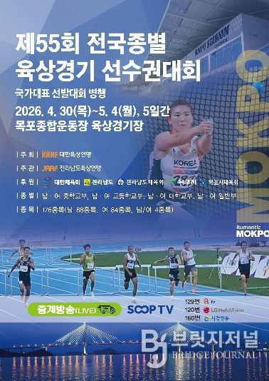 브릿지저널 김경미 기자 | 목포시는 오는 4월 30일부터 5월 4일까지 5일간 목포종합경기장에서 ‘제55회 전국종별육상경기선수권대회’와 ‘2026 아시아투척선수권대회’를 개최한다고 밝혔다.