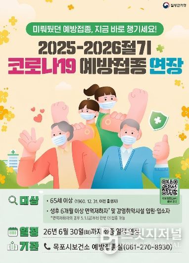 브릿지저널 김경미 기자 | 목포시는 2025~2026절기 코로나19 예방접종사업 기간을 오는 5월 1일부터 6월 30일까지 2개월간 연장 운영한다고 밝혔다.
