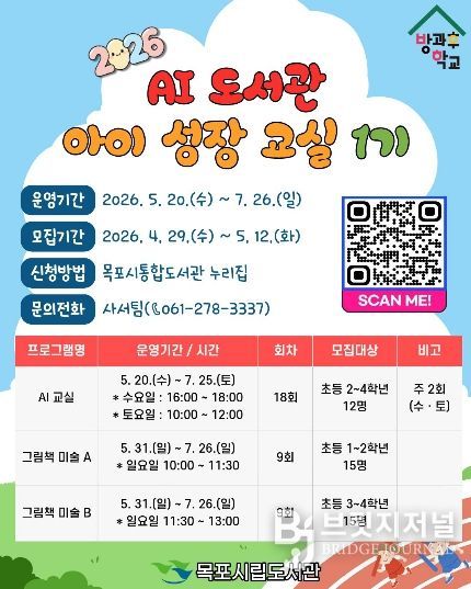 브릿지저널 김경미 기자 | 목포시립도서관은 관내 초등학생을 대상으로 AI 융합 체험형 프로그램 ‘AI 도서관·아이 성장 교실’을 오는 5월 20일부터 운영한다.