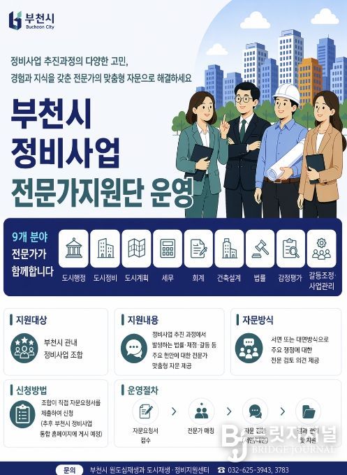 브릿지저널 김경미 기자 | 부천시는 정비사업 추진 과정에서 발생하는 법률·재정·갈등 등 주요 현안에 대한 전문 자문을 지원하기 위해 ‘정비사업 전문가지원단’을 구성해 운영한다고 지난 28일 밝혔다.