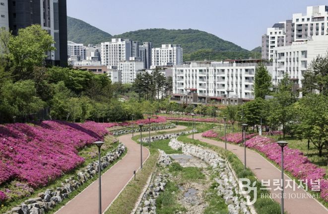 브릿지저널 김경미 기자 | 의왕시 백운밸리 지역의 생태 소하천 ‘바라천’이 봄을 맞아 화사한 철쭉(자산홍)으로 물들었다. 총길이 약 1km에 이르는 이 산책로에는 분홍빛 철쭉이 줄지어 피어나며 방문객들에게 아름다운 풍경을 선사하고 있다.