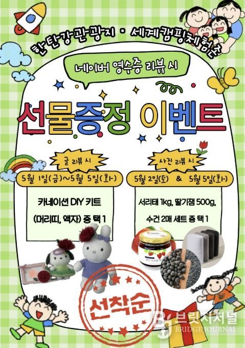 브릿지저널 김경미 기자 | 연천군시설관리공단은 가정의 달을 맞이해 오는 5월 1일부터 5월 5일 내 한탄강관광지 오토캠핑장 및 세계캠핑체험존을 방문하는 가족 단위 관광객을 위한 참여형 이벤트를 운영한다.