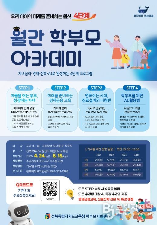 브릿지저널 윤나영 기자 | 전북특별자치도교육청 학부모지원센터는 학부모의 자녀교육 역량 강화를 위해 ‘월간 학부모 아카데미’를 운영한다고 28일 밝혔다.