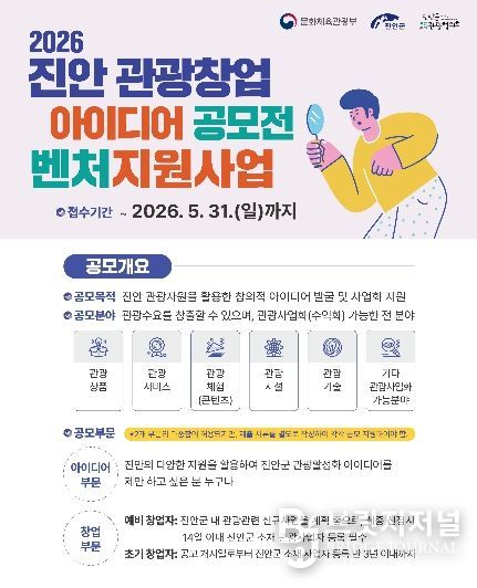 브릿지저널 윤나영 기자 | (사)진안군관광협의회(이사장 이재동)가 지역 관광자원을 활용한 창의적인 아이디어를 발굴하고 실질적인 사업화를 지원하기 위해 ‘2026 진안 관광창업 아이디어 공모전’을 개최한다.